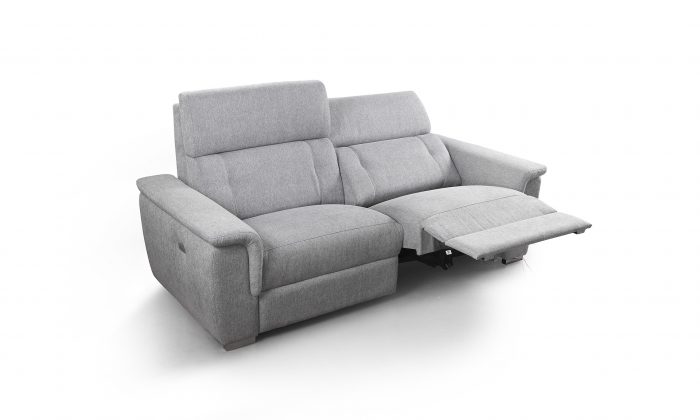 Photo d'un salon présentant deux canapés de la même collection. Les canapés sont revêtus d'un tissu gris clair avec de petites nuances de blanc. L'ensemble est composé d'un canapé 2,5 places et d'un canapé 2 places, tous deux équipés d'une fonction de relaxation électrique et d'appuie-têtes réglables manuellement.