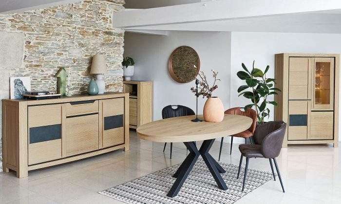 Photo d'une salle à manger avec une collection comprenant une table de repas fermé et chaise. Les meubles présentent des finitions en céramique effet chêne clair et des piétements en métal noir.